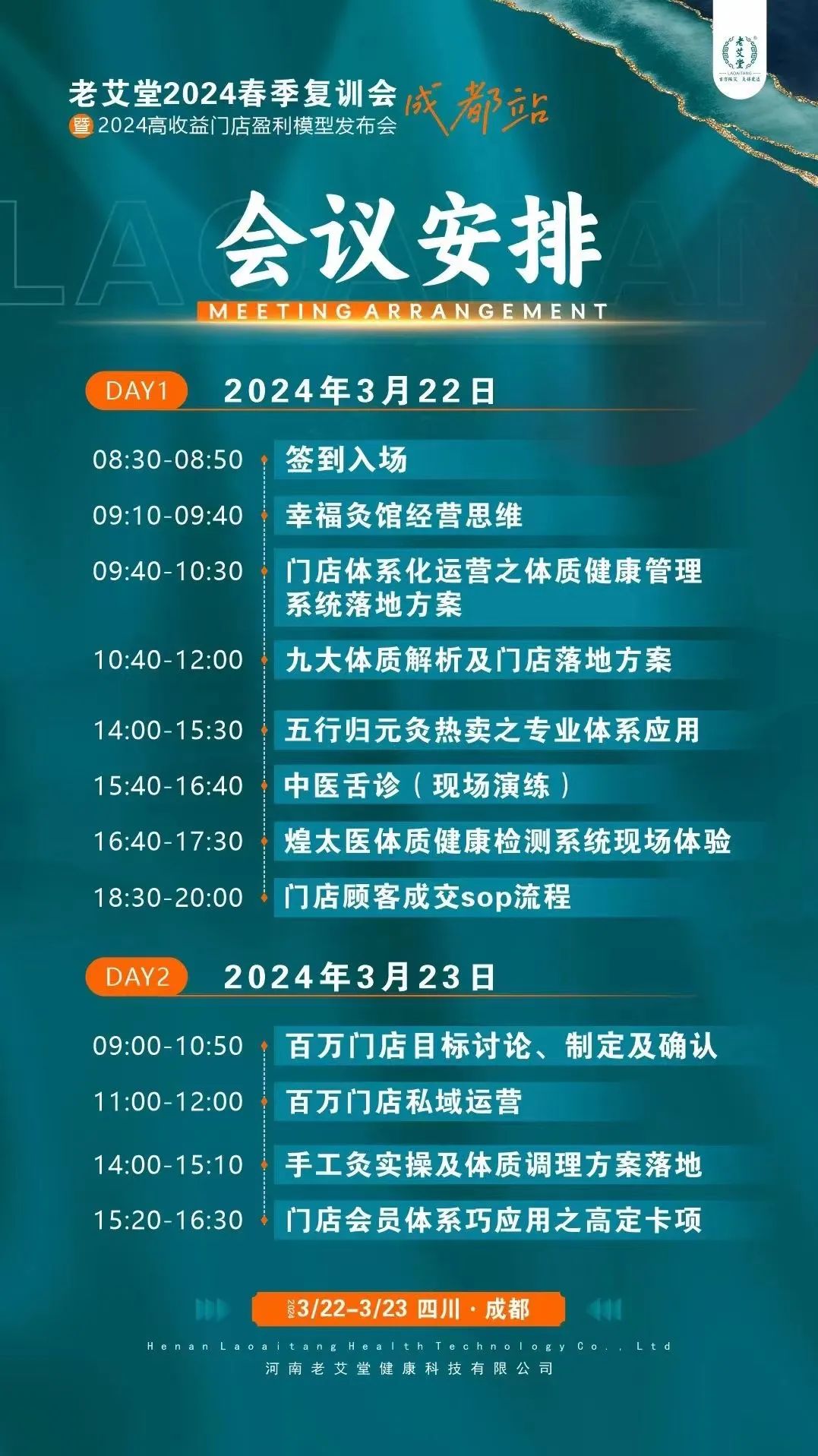 3月22-24日,春季復(fù)訓(xùn)成都站,老艾堂再次出征,立足春季市場,以專業(yè)與卓越應(yīng)對市場變化。如果你也想復(fù)制王院長的成功,打造高盈利店面,那就來到四川成都牽手老艾堂。2024,讓我們一起思維迭代主動出擊,打一場大勝仗!